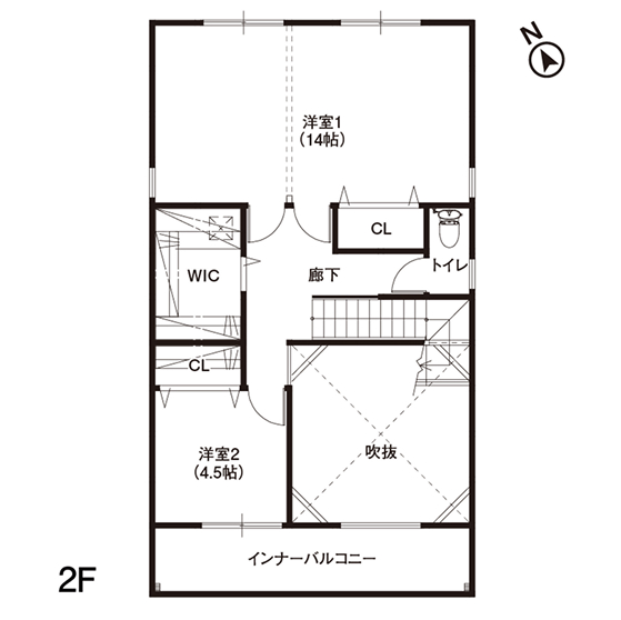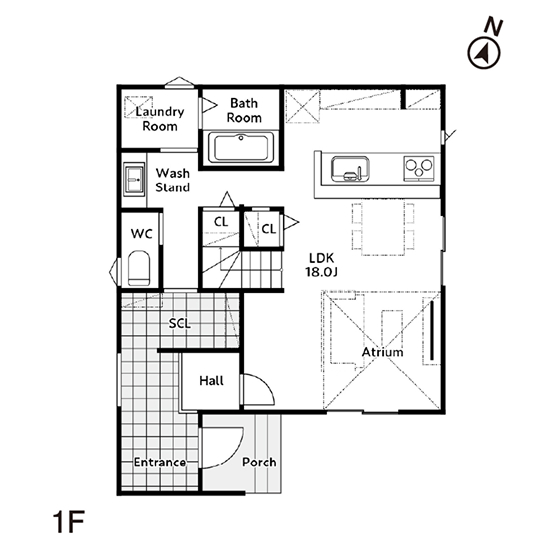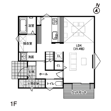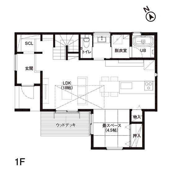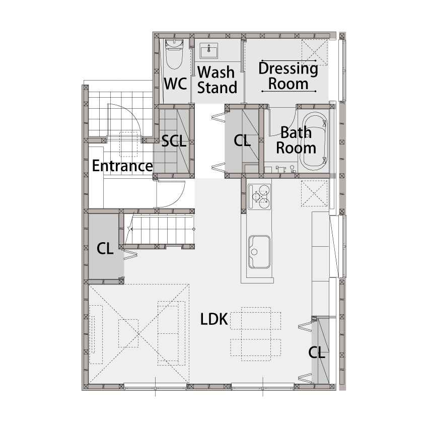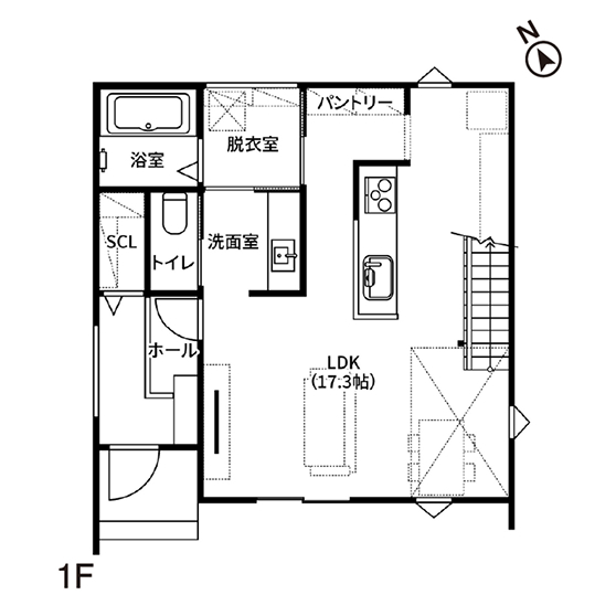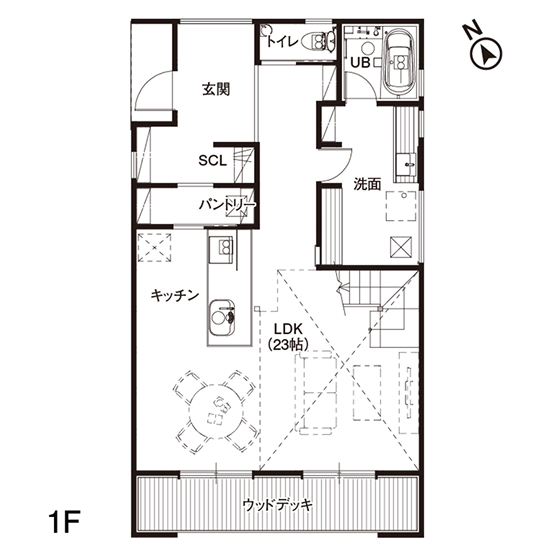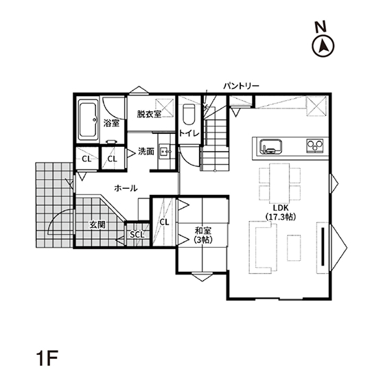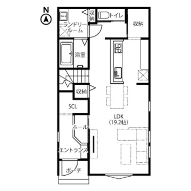 コンパクトな間口に対して広がりのあるLDKが特徴。効率の良い家事動線やコンパクトな敷地を検討されている方にも参考になるプランです。